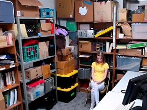 Ein Sicherheitsbeamter erwischt eine blonde Süße beim Stehlen von Strümpfen, also führt er eine Leibesvisitation und eine tiefe Hohlraumsuche durch.Er reibt die Muschi der kleinen Titten Babes und lässt sie dann seinen großen Schwanz blasen.Die Süße liegt