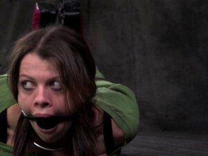 Brünette mit Stock und Knebel in Fußsuspension. Brünette Missy Minks wird an den Nippeln gequält und gefesselt und ausgepeitscht, dann in Fußsuspension mit Stock und Schwanz im Kerker